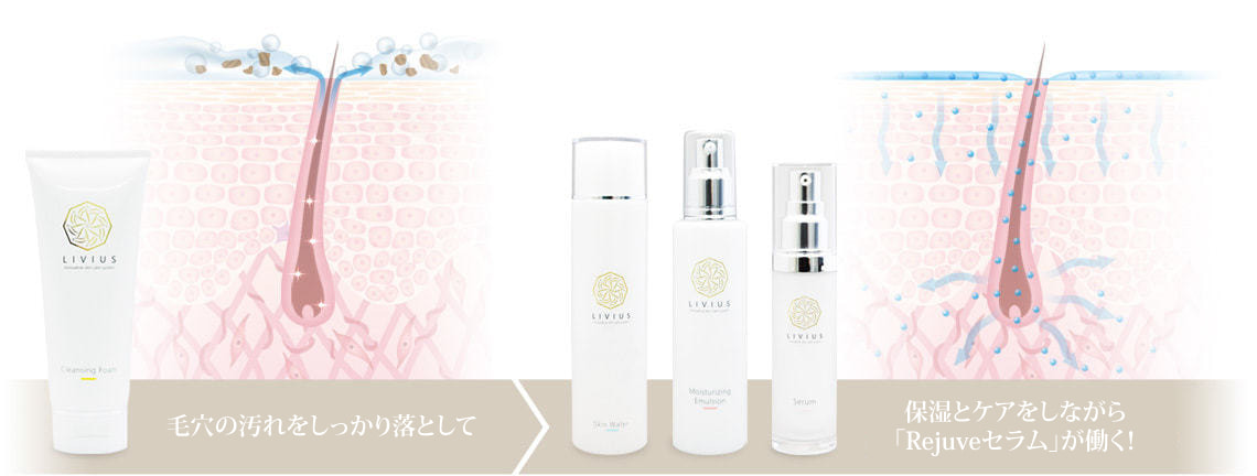 LIVIUSのセットは、非常にサラッとした使用感が特徴となっています。私達のスキンケアシステムは「Rejuveセラム」を確実に皮膚に送り込むことに着眼しています。また、保湿力、使用感、そして成分の組成の多面的な観点から、最良の調整の結果を製品化しています。